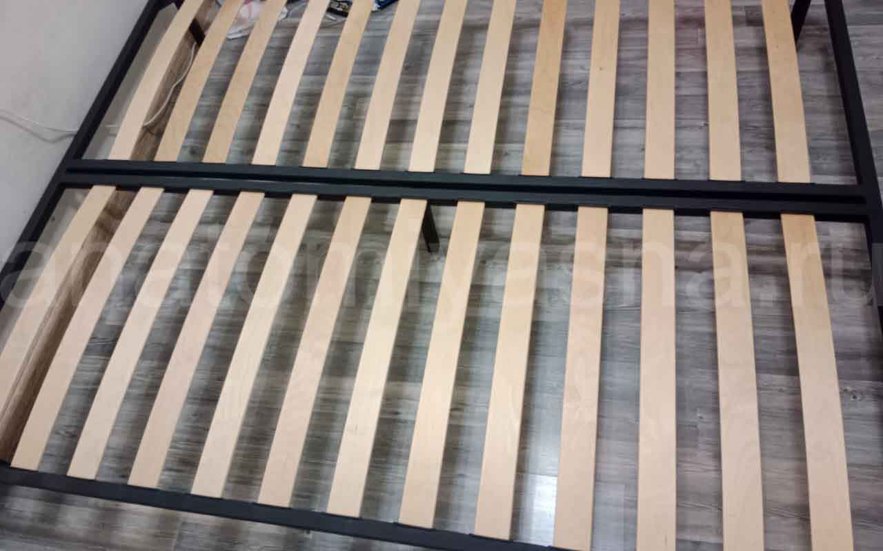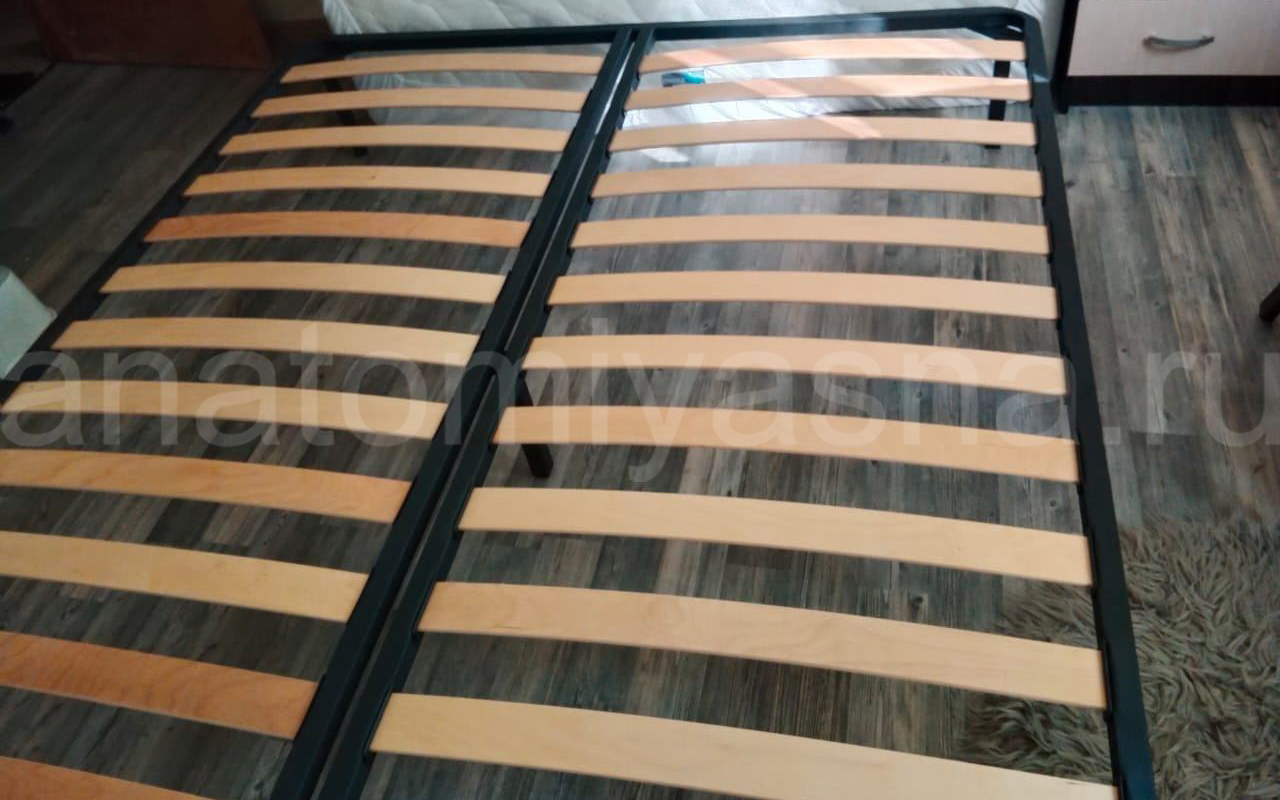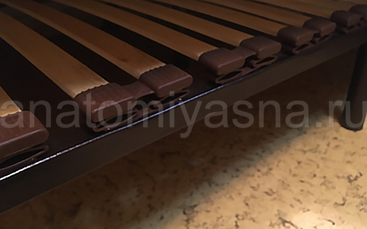 Состоит из 15 двойных рядом ламелей, они узкие. Можно использовать с любым пружинным матрасом. Каркас металлический, 5 ножек (1 по центру), выдерживает очень большую нагрузку. Спасибо магазину "Анатомия сна".
